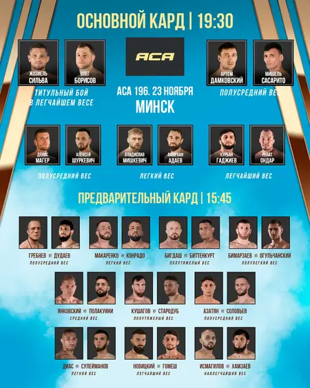 В со-главном поединке вечера два ветерана российский лиги АСА встретятся в лимите полусреднего веса. Громкий бой между Артемом Дамковским и Мишелем Сильвой запланирован на сегодняшнем турнире. Также сегодня мы увидим бои Дениса Магера и Алексея Шуркевича (полусредний вес), Владислава Мильшкевича и Амирхана Адаева (легкий вес), Курбан Гаджиев и Ренат Ондар (легчайший вес). Полный кард турнира на фото ниже: